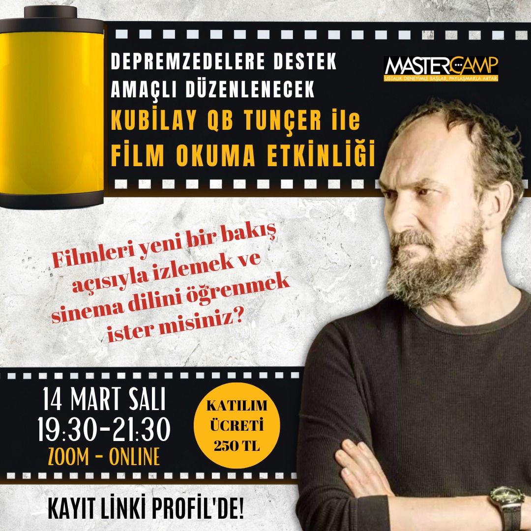 Depremzedelere destek amaçlı Kubilay QB Tunçer ile düzenlediğimiz “Film Okuma Etkinliği” 14 Mart Salı günü 19:30-21:30 arasında Zoom üzerinden ONLINE olarak gerçekleşecektir.